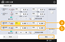1 | 在<调整图像位置>屏幕 为<缩放倍率(f)>和<缩放倍率(d)>设置放大/缩小比率(%) 按<完成>。![]() <缩放倍率(f)>按照输入比率,沿着与进纸方向平行的方向放大或缩小图像。 <缩放倍率(d)>按照输入比率,沿着与进纸方向垂直的方向放大或缩小图像。 必要时,再次尝试打印出测试页纸张并检查校正量。 |