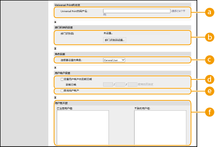 [部门识别码:]使用“部门识别码管理”时,必须单击[部门识别码设置...]并从列表中选择要指定给用户的“部门识别码”。首先,在列表屏幕上的[注册新部门...]中注册必要的“部门识别码”。如果稍后删除了此处指定的“部门识别码”,请确保更改此设置。