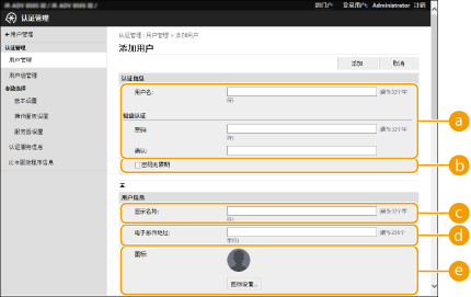 通过操作面板配置设置也可以按  (设置/注册)  <管理设置>  <用户管理>  <认证管理>  <注册/编辑认证用户>注册用户信息。 <注册/编辑认证用户>创建用户组“地址簿”中的“地址列表”可以在用户组中注册的用户之间共享。 注册用户组 |