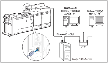 ここでは、本体へのLANケーブルの接続、本体操作パネルで行うネットワークの設定について説明しています。ネットワーク設定の詳細については、imagePRESS Serverの説明書を参照してください。 本製品にネットワークケーブルは付属していません。あらかじめご使用のコンピューターやネットワークに合ったケーブル(別売)をご用意ください。詳しい接続方法は担当サービスにお問い合わせください。 |