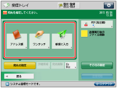 [新規宛先の制限]で新規宛先の入力制限が「ON」に設定されている宛先種別は、新規で宛先を入力できません。すでに登録されている宛先をローカルアドレス帳、リモートアドレス帳、LDAPサーバーから検索、または、ワンタッチから選択してください。(→送信機能の制限) |