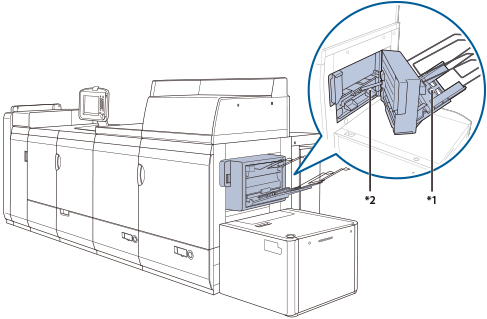 紙づまりが起きているのは以下の箇所です。紙づまり処理の参考にしてください。 *1 給紙延長トレイ(下)上 *2 長尺用トレイ・Dカバー内 長尺用トレイ・Dはオプションです。 |