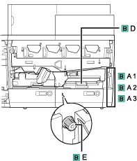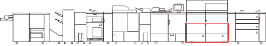 下搬送部と本体ペーパーデッキの紙詰まりを処理します。下搬送部と本体ペーパーデッキは、全体図で見ると以下の箇所です。