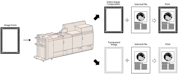 If the size of the image form differs from the original, this mode may not operate correctly. Use the same size image form and original for this mode. Printing performance may not be optimal, depending on the content of the file and image form. The density of CMYK format images for Superimpose Image may become lighter when printing with the Superimpose Image mode. The moiré effect (a shimmering, wavy pattern) may occur, depending on the content of the file and image form. |