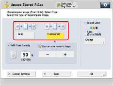 To use the Superimpose Image mode, the image form must be registered in the machine beforehand. (See "Setting the Stacker Output Tray.") |