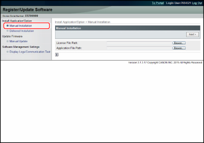 From the portal page of the Remote UI, click [Settings/Registration] → [License/Other] → [Register/Update Software].