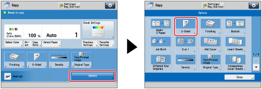 2-Sided].[Left/Right 2-Sided]: | Copies the facing pages of a book or bound original onto the front and back sides of a single sheet of paper. |