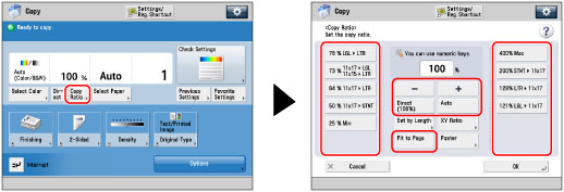 If the output size differs from your specified copy ratio, you can adjust it using [Fine Adjust Zoom] in [Adjustment/Maintenance] (Settings/Registration). (See "Zoom Fine Adjustment.") The reduction ratios when [Fit to Page] is specified are: 11" x 17"/LGL: approximately 98% (12" x 18": 100%) LTR: approximately 97% STMT: approximately 96% To return the ratio to 100%, press [1:1 (100%)]. |