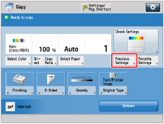 Copy settings are counted as single recent copy settings until the following times: If they are not set as a single setting, the settings cannot be recalled with [Previous Settings]. When you press (Start).When you press (Reset).When Favorite Settings are recalled. You cannot recall the Merge Job Blocks mode with [Previous Settings]. The Standard mode cannot be recalled or stored. Identical copy settings are stored only once in memory. |