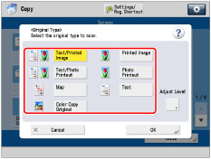 To adjust the text/photo processing priority level, press [Text/Printed Image], [Text/Photo Printout], [Map], or [Color Copy Original].