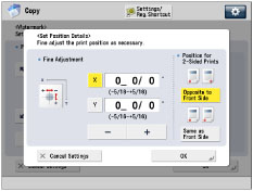 To set the printing position for the back side when performing two-sided copying, select [Opposite to Front Side] or [Same as Front Side] → press [OK].