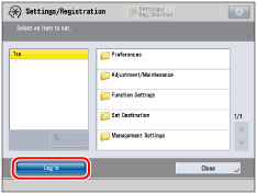 When you are finished with the operation, press [Log Out] or (Log In/Out) on the control panel to log out.To return to the Main Menu screen, press (Main Menu). |