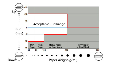 If you feed paper from 28 lb bond to 60 lb cover (106 to 163 g/m2) in weight, we recommend using paper which curls up 3/8" (10 mm) or less, or paper which curls down 1/4" (5 mm) or less.