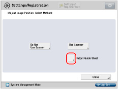 Before adjustment, print the guide sheet (A3 or 11" x 17") under the following conditions. Accurate adjustment may not be possible if the guide sheet is not printed correctly. Select the same size as the guide sheet. Use paper with a weight of more than 200 g/m2. Set the zoom ratio as 100%. If an edge of the test page is cut incorrectly or folded, or the image is not correctly printed on the test page, the message "Correctly place the test page on the platen glass." may appear during the scanning process. Adjustment may not be performed correctly with some types of paper, such as textured paper with rough surface or colored paper. If adjustment is not performed correctly when [Use Scanner] is selected, select [Do Not Use Scanner] instead. |