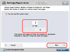 The larger the number of output test pages, the more accurate the adjustment is. If specifying multiple output test pages, make sure that all of the test pages are scanned in the order they are output. If the order is changed or the scanning process is not performed successively, the adjustment may not be made correctly. |