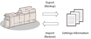 If you perform the Import All function in the following cases, setting values may not be imported or may be changed into similar values. The required optional equipment is not attached or function related to the setting information is unavailable. The importing setting value is not valid in the destination machine for importing. |