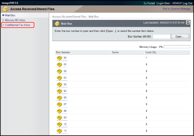 You can also select the desired inbox by entering its number next to <Box Number (00-49)> → click [Open].