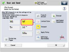 (Main Menu) → [Scan and Send] → specify the destination → press the file format button.