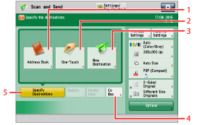 2 | [One-Touch] Press to display the screen for registering/specifying one-touch buttons. Press [To Remote Add. Book] to specify destinations registered in the one-touch buttons of a server machine by accessing from a client machine on the network. For more information, see "Specifying Destinations from the One-Touch Buttons of a Server Machine." |