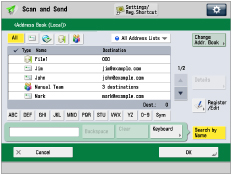 5 | [Search by Name] Press [Search by Name] to display the search screen for a destination name. You can narrow the search by entering multiple consecutive characters, starting with the first character of the destination name. You can also narrow the addresses displayed by using the [Keyboard] to enter multiple letters. ![]() [ABC] - [Sym] Press to display the characters you can enter. The range of letters or the symbols you can enter appear. [Keyboard] Press to display the keyboard on the touch panel. [Clear] Press to delete all of the text entered. [Backspace] Press to delete the last letter entered. |