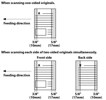When [Auto (Color/Gray)] or [Auto (Color/B&W)] is set and your originals contain color sections, the machine scans them in the Full Color mode. However, the machine may scan the color originals in the Black mode under the conditions below. To avoid this, set the color mode to [Full Color]. If the originals contain very few color sections If the color sections of the originals are close to black If the originals contain light color densities If the color sections are located only in the range indicated by the diagram below, when loading the originals in the feeder ![]() |