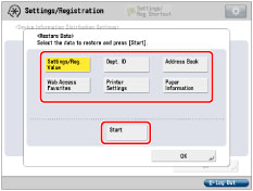 If you do not restore data for [Settings/Reg. Value] and [Address Book] at the same time, the settings in [URL Send Settings] for [Set Fax/I-Fax Inbox] and [Mail Box Settings] may be erased. |