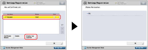 Key pairs for which 'Used' is displayed in <Status> cannot be deleted because they are being used with the IEEE802.1X authentication/IPSec or because TLS is set to 'On'. Press [Display Use Location] to check the type of security the key pair is being used for. To delete a key pair which is only being used with TLS, set the following settings to 'Off'. A key pair being used for IEEE802.1X authentication/IPSec cannot be deleted. <Use TLS> in [Remote UI] (For details, see the manual of the imagePRESS Server.) <SMTP RX> in [E-Mail/I-Fax Settings] (See "E-Mail/I-Fax Settings.") [Restrict Receiving for Each Function] in [Device Information Distribution Settings] (See "Registering/Deleting/Printing Delivery Destinations.") |
