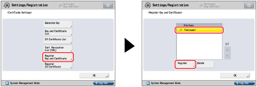 Press [Register Key and Certificate] → select the file to register → press [Register].
