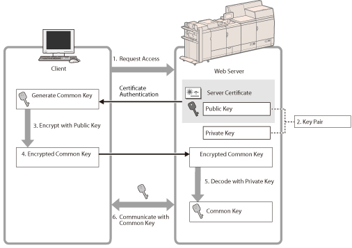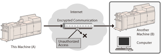 You can perform safe encrypted communication when the user is accessing the machine via a Web browser by installing a server certificate to the machine. With TLS communication, a common key that can only be used by the user and the machine is generated using the server certificate and public key. Doing so will help prevent data interception and theft. See "Key Pair and Server Certificate Settings for Encrypted TLS Communication" and "Setting the Key Pair Used With TLS Encrypted Communications."