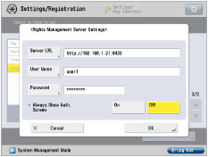 Adobe LiveCycle Rights Management ES or Adobe LiveCycle Rights Management ES2 is required to set this function. For more information, contact your local authorized Canon dealer. To set this function, the Adobe LiveCycle Rights Management server and this machine must be connected via the Internet or an intranet. |