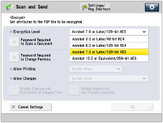 If you select [Acrobat 10.0 or Equivalent], [Acrobat 10.0 or Equivalent/256-bit AES] is displayed when selecting the encryption level.