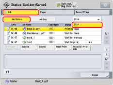 If you select a print job and press [Details], press [Paper Feed] to forcibly print the print data remaining in the memory, and press [Skip Error] to temporarily disable errors and continue printing. [Paper Feed] and [Skip Error] can only be used for print jobs sent from the computer. If the paper specified at the time the job was issued is not available, a message asking you to load the appropriate paper appears. Load the paper, and resume the job. If [Suspended Job Timeout] in [Function Settings] (Settings/Registration) is set to 'On', the job which is suspended because paper was not available for printing is displayed as a suspended job after a specified period of time elapses. To resume printing of the suspended job, load the paper → select the job → press [Details] → [Resume]. |