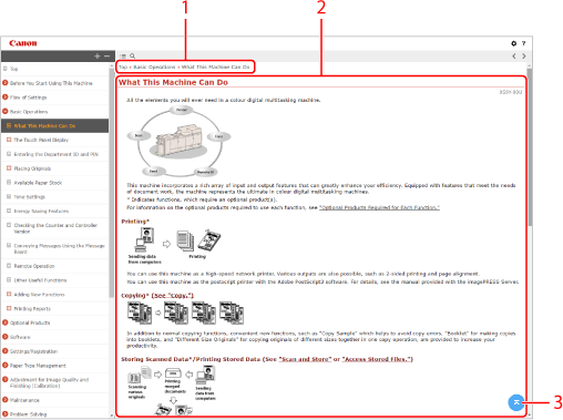 The explanatory pages under each category in the User's Guide are called "topics." They appear in a screen similar to the one below.