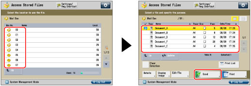 A maximum of 32 files stored in the same mail box can be selected and sent at the same time. A maximum of 999 pages can be sent simultaneously. |