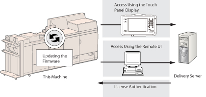 You can update the firmware of the machine to the most recent version using the "Register/Update Software." You can use this function from both the touch panel display and the computer (Remote UI).