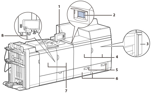7. | LAN Port Located on the upper left area of the marking engine. Use this port to connect the machine to the network (imagePRESS Server). |