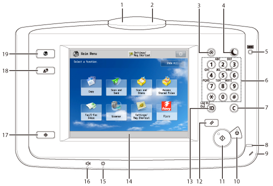 14. | Touch Panel Display The settings screen for each function is shown on this display. Eight function keys are displayed by default. |
