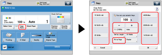 If the output size differs from your specified copy ratio, you can adjust it using [Fine Adjust Zoom] in [Adjustment/Maintenance] (Settings/Registration). (See "Zoom Fine Adjustment.") The reduction ratios when [Fit to Page] is specified are: A3: approximately 98% A4: approximately 97% A5: approximately 96% To return the ratio to 100%, press [1:1 (100%)]. |