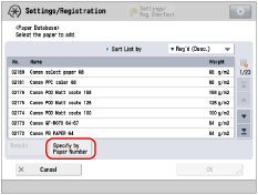 Press [Paper Database] → [Specify by Paper Number].