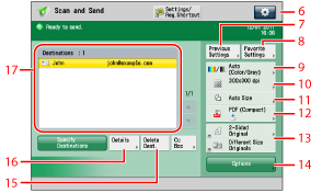 14 | [Options] Press to select and use other modes available for scanning and sending. Set useful send functions such as sending different sized originals together or sending 2-sided originals. |