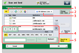 1 | Specify Type of Destination button Press [All], (E-Mail), (I-Fax), (File), (Group) to display destinations registered in each type. |