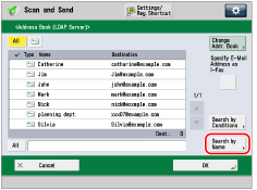 If you perform a new destination search when a search result is already displayed on the destination list screen, the displayed search result is cleared. If the search result for specified criteria is displayed, the search result is cleared and search for all criteria is processed when you press [All]. If you set [Auto Search When Using LDAP Server] to 'Off', nothing appears on the destination list screen until you perform a search. If the search result from [Search by Conditions] is displayed on the search list screen, you cannot additionally press [Search by Name] to narrow the search by name. |