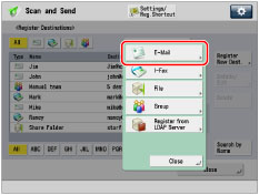 The first character that you enter for the name is used for sorting the destination list when you press keys, such as [ABC], [DEF], and [GHI], on the Address Book screen. If [Search by Name] is pressed on the Address Book screen, a screen for narrowing the search in the Address Book appears. |