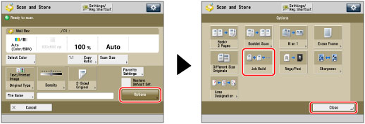 If you place your originals in the feeder, remove the originals from the original output area when the scanning of each batch is complete. You can change only those settings appearing in [Change Settings] while in the Job Build mode. You need to specify the necessary scan settings in advance. |