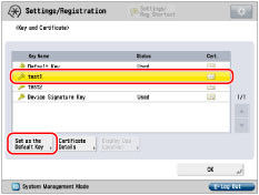 A key pair and server certificate are preinstalled in the machine. You can perform encrypted TLS communication using the preinstalled key pair and server certificate. The name of the preinstalled key pair is 'Default Key'. If you press [Certificate Details], you can check the certificate. If you press [Display Use Location], you can check what the key is being used for. |