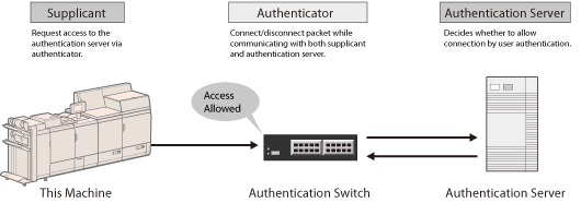 The authenticator blocks communication for the supplicant that is not authenticated by the RADIUS server. For details, see the manual of the imagePRESS Server.