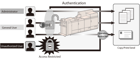 The authentication on this machine requests user information (user name and password) when users access the machine, and verifies that information. Only an authorized user that has successfully passed the authentication can operate the machine. You can prevent access by unauthorized users by managing the users for the machine. To use the authentication mode, you must first register the information for administrators and general users.