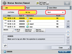 In order for you to receive a confirmation message telling you the delivery status of your I-fax document, the recipient's machine must have I-fax capabilities and be compatible with the Full mode. If you send documents using the Full mode to a machine that does not support the Full mode, delivery confirmation cannot be carried out. When this happens, the job concerned is not considered as complete even if the actual sending of the document is successful. Such jobs appear as <Waiting for TX result> on the Job Status screen until the time set for [Full Mode TX Timeout] in [E-Mail/I-Fax Settings] in [Function Settings] has lapsed. After the time set for [Full Mode TX Timeout] has lapsed, the job is moved to the log, and the result is shown as <-> when sending of the document to a server or other destination could not be verified. (See "Full Mode TX Timeout.") You can confirm the delivery status of the document by pressing → [Job] → [Job Log] → [Send]. If the document was received successfully, [OK] will be displayed, if it failed to send, [NG] will be displayed, and if the results cannot be confirmed, [--] will be displayed. In the Simple mode, delivery confirmation is disabled. Even if the delivery was successful, [--] will be displayed.![]() |