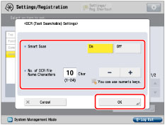 Press [On] for <Smart Scan> → press [-] or [+] for <No. of OCR File Name Characters> to set the number of characters for the file name → press [OK].