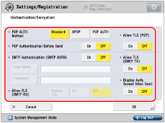 Even if you select [On] for <Allow TLS (SMTP TX)>, the data will not be encrypted if the SMTP host does not support encryption. Even if you select [On] for <Allow TLS (POP)>, the data will not be encrypted if the POP server does not support encryption. |